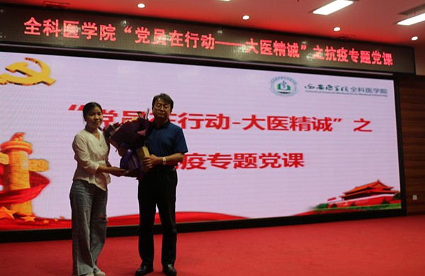 为践行立德树人根本任务,引导广大师生树立使命与担当意识,2020年5月27日,全科医学院党总支特邀西安医学院第一附属医院党委书记、全科医学院党总支书记吴戈,西安医学院第一附属医院第二批援鄂医疗队成员刁鑫副教授为师生做抗疫专题党课报告。西安医学院第一附属医院党委副书记、纪委书记张蔚以及全科医学院全体教职工党员、实习学生、住培医师参加了活动。