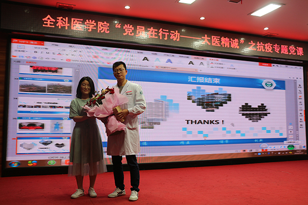 全科医学院此次“党员在行动-大医精诚”之抗疫专题党课在学生中也引起强烈的反响。实习医生陈朝林说道“刁鑫老师和其他坚守在抗疫一线的老师都是我们学习的榜样,他们用实际行动教会了我们医生的使命与责任。让我们对健康所系,性命相托有了更深刻的理解”。住培医师张凡说道“此次疫情让我们更加直观的感受到了祖国的伟大和人民的团结,相信在习近平总书记的带领下,在全国人民的努力下,我们一定会完全战胜疫情并实现全面建成小康社会的目标”。(全科医学院 文/图 冯帅)